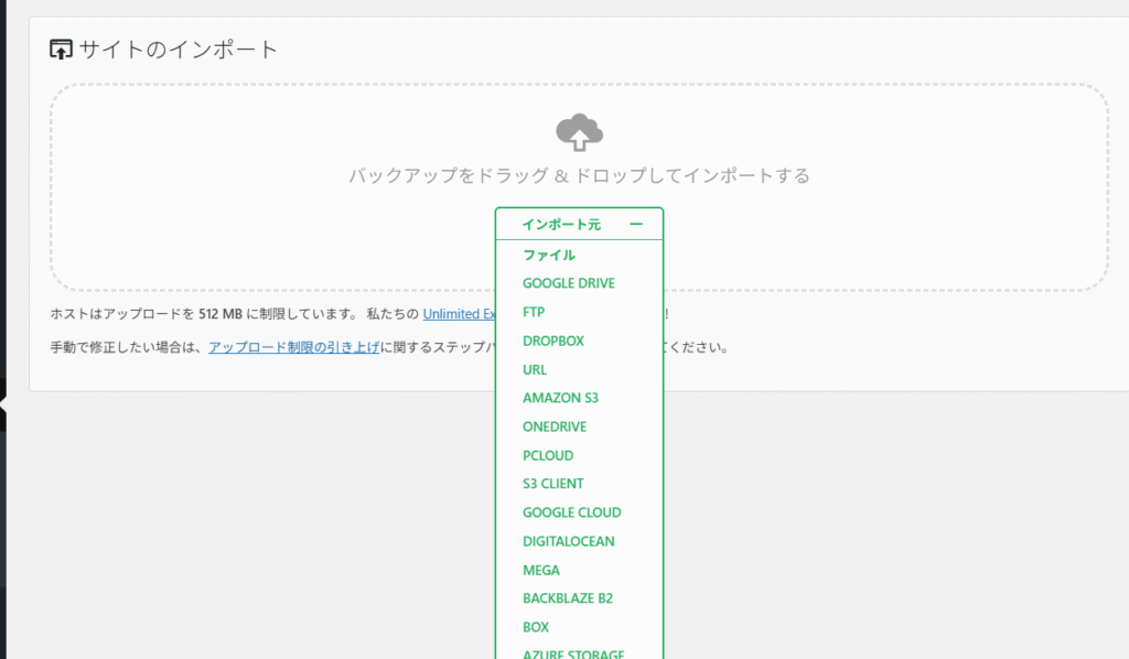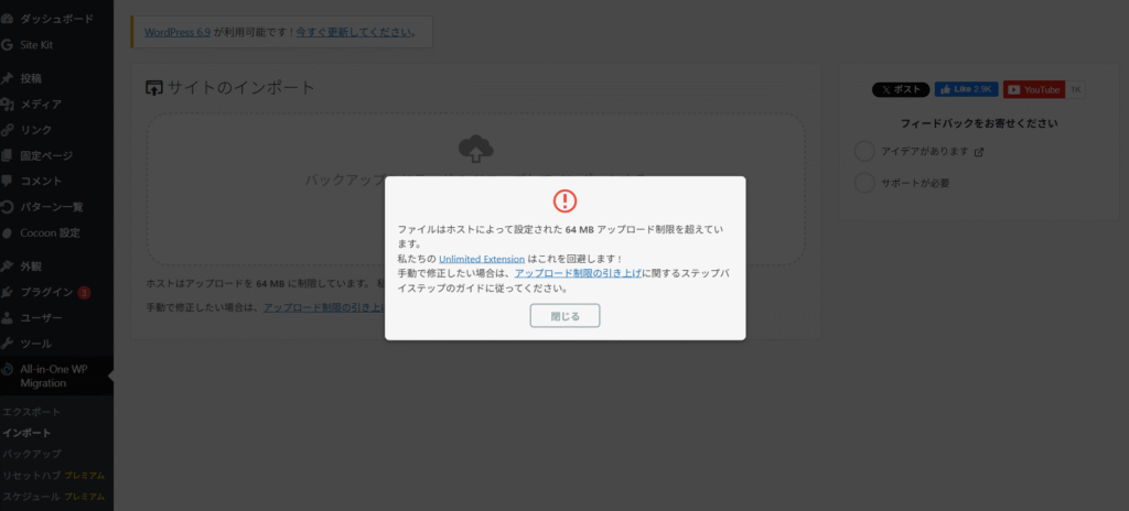 インポートファイルのサイズが132MBなのでエラーが発生