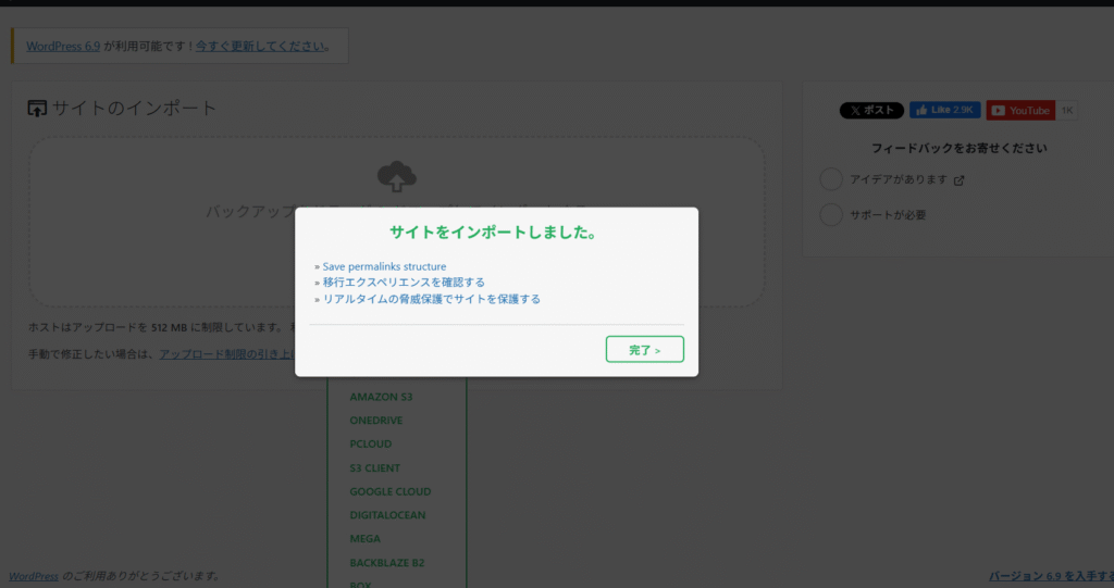 ※移行完了後、設定項目3つとプラグイン「All-in-One WP Migration」を削除する。残しておいても問題はなさそう