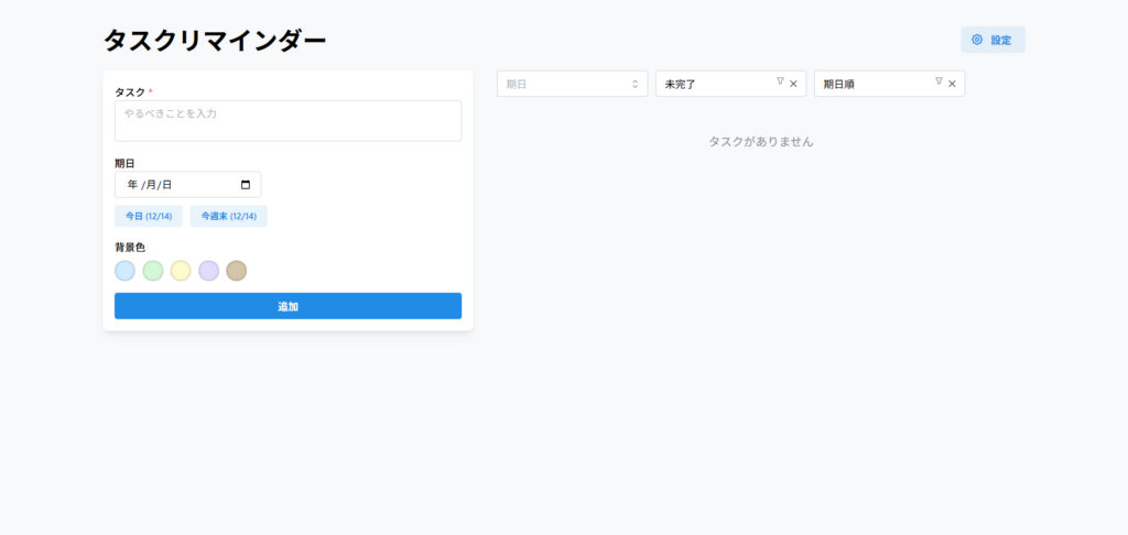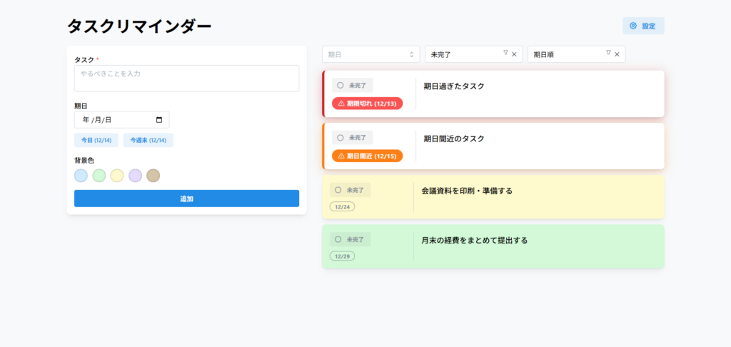 モダンなUI や タスクの追加・編集・削除、期日管理、フィルタリング・ソート、設定機能 を確認できます。