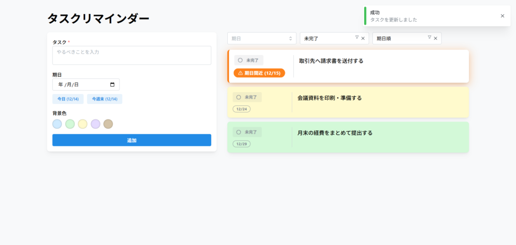 期日管理とリマインダー機能を備えたタスク管理アプリ